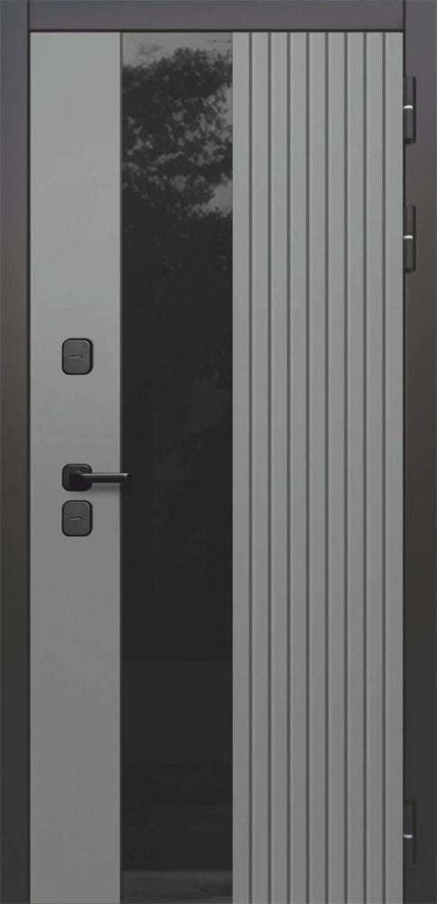 Наружная отделка: металл с МДФ панелью, цвет Эмаль 7024, наличник цвет Эмаль 9005